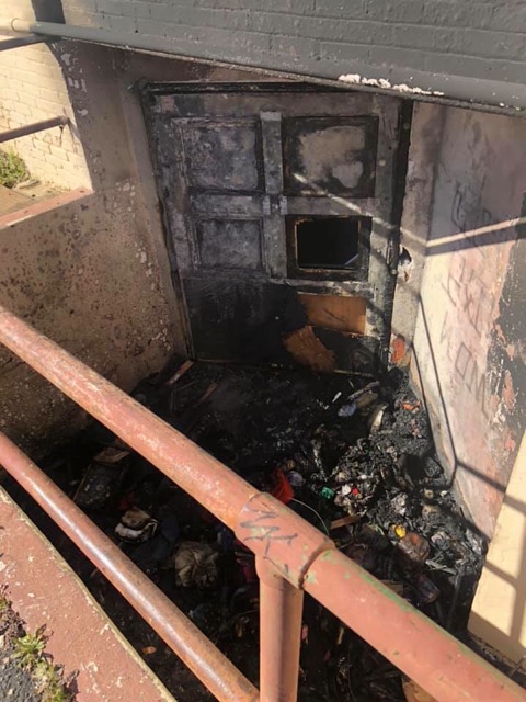 Above: photo of the exterior damage, in the stairwell just outside the east door of the Fox where a homeless person had been camping out.